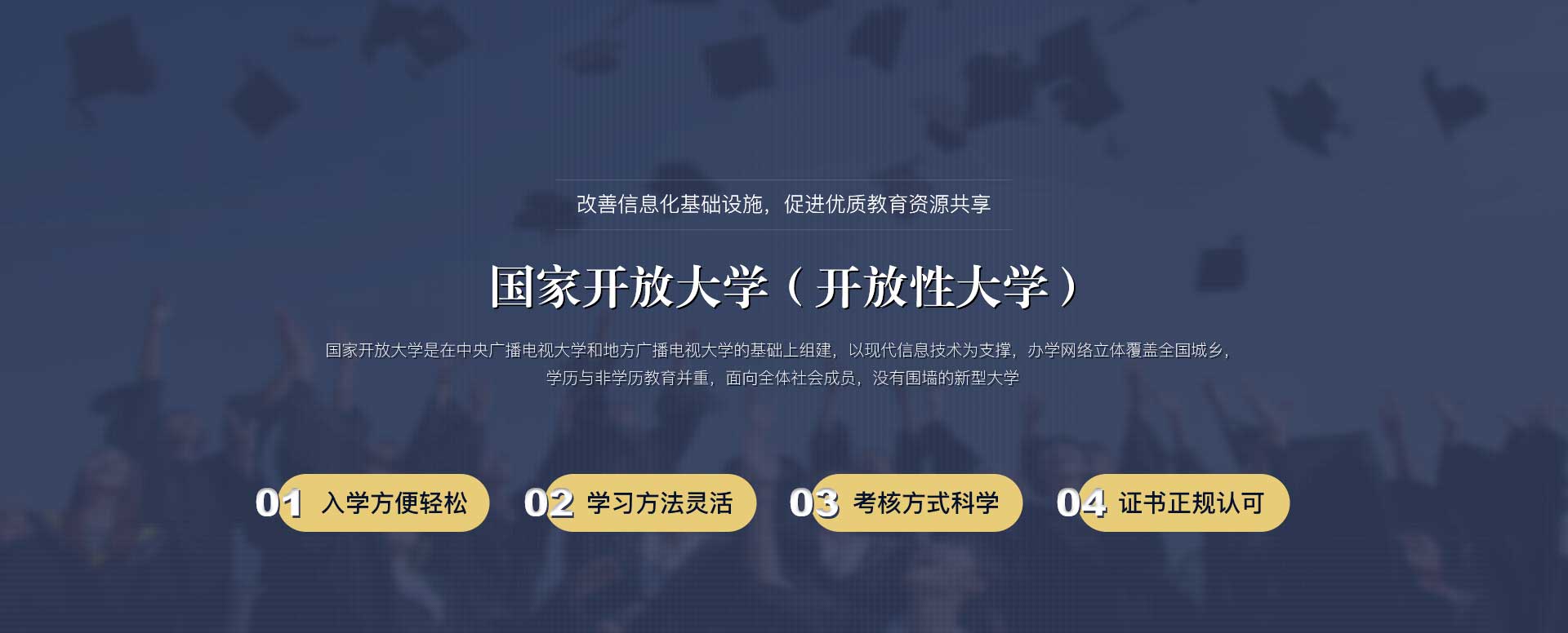 开放式学习 国家开放大学致力于实现有支持的开放式学习,探索以学习者为中心,基于网络自主学习、远程学习支持服务与面授辅导相结合的新型学习模式 | 科学/灵活/有针对性 以需求为导向,以能力培养为核心,改革教学内容和课程体系,与行业企业合作,科学、灵活、有针对性地开设国家开放大学特色专业 | |